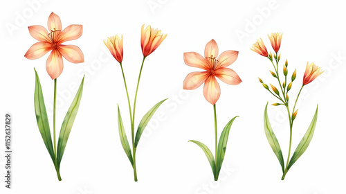 Naklejka premium Elegant peach blossoms on stems, showcasing delicate petals and vibrant green leaves against a stark white background. A tranquil botanical illustration.