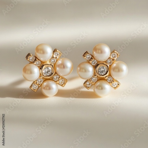 © Lui Shtein, Fototapeta premium Elegant pearl and diamond flower earrings on soft background