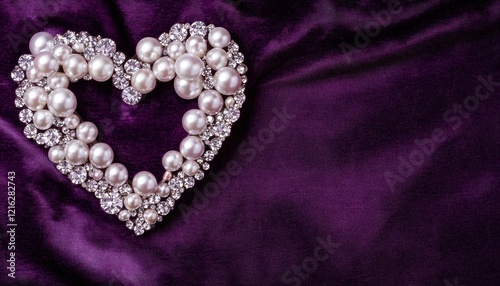 © Riz, Obraz premium Elegant Pearl and Diamond Heart Brooch on Purple Velvet