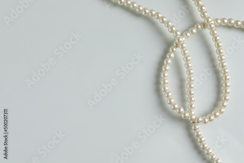 © New Africa, Fototapeta premium Elegant pearl necklace on white table, top view. Space for text
