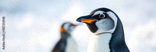© Yury, Naklejka premium Elegant Penguin with Focused Gaze Standing Against Snowy Background