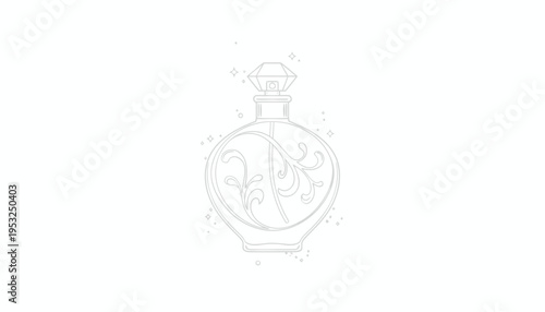 © Lisa, Obraz premium Elegant Perfume Bottle Outline with Swirls and Sparkles - Vector Illustration