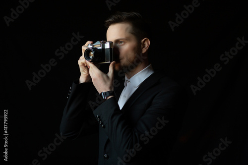 Fototapeta premium Elegant photographer wearing a suit is holding a vintage camera over black...