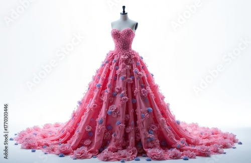 © Maryna, Naklejka premium Elegant pink ball gown on mannequin isolated on white studio background. Strapless dress features long train, 3D floral appliques. Luxury couture garment for prom gala fairytale wedding. Beautiful