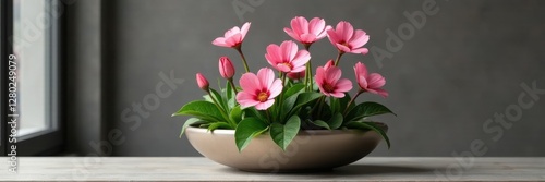 © Pongpob, Obraz premium Elegant pink eustoma arrangement in a sleek metal planter , eustoma, metal planter