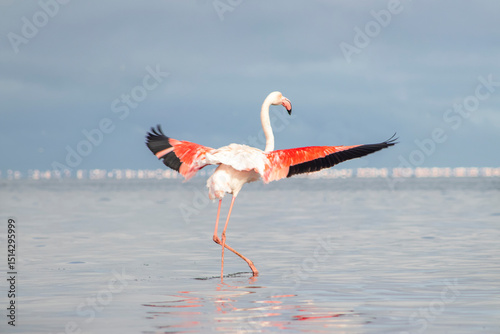 Fototapeta premium Elegant pink flamingo wading through a vivid blue lagoon on a sunny day....