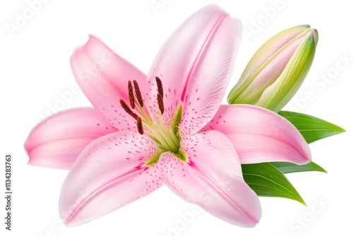 Naklejka premium Elegant Pink Lily Blossom Isolated on Bright White Background with Lush Green Leaves and Buds