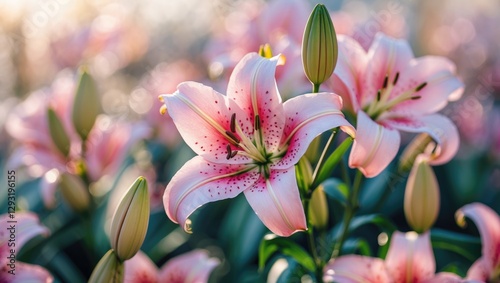 Fototapeta premium Elegant Pink Lily in Soft Natural Light with Blurred Background and Space for...