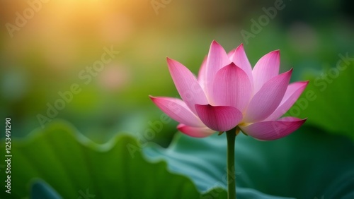 © Firman Dasmir, Obraz premium Elegant pink lotus blossom in tranquil pond setting under golden light