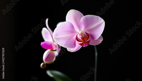 © Jonisa, Fototapeta premium Elegant pink orchid blossoms against a sleek dark backdrop, captivating floral arrangement