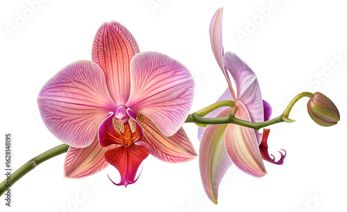 © Rozena, Naklejka premium Elegant pink orchid flowers with vibrant petals and green stems on a dark background photography