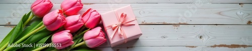 Fototapeta premium Elegant pink tulips, small gift, wooden backdrop, spring theme , pink, nature