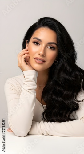 Fototapeta premium Elegant Portrait of a Beautiful Woman with Flowing Dark Hair, Soft Lighting and a Serene Expression, Ideal for Beauty and Lifestyle Content