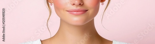© Sukkamon, Obraz premium Elegant Portrait of a Smiling Young Woman with Natural Makeup Against Soft Pink Background