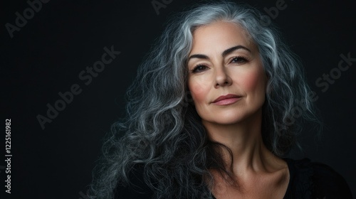 © The 2R Artificiality, Fototapeta premium Elegant portrait of middle-aged woman with silver curly hair in black stage costume on dark background showcasing beauty and fashion concepts