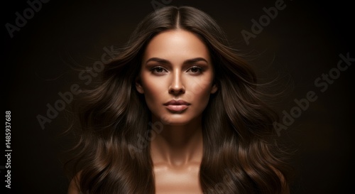 Fototapeta premium Elegant portrait of woman with long flowing hair on dark background for...