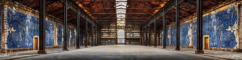 © Mehreen, Fototapeta premium Elegant Portuguese warehouse with historic blue azulejo tiles and structural iron beams.