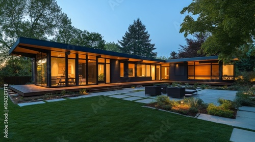 Fototapeta premium Elegant prefab house with sleek lines and garden lighting creating ambiance...