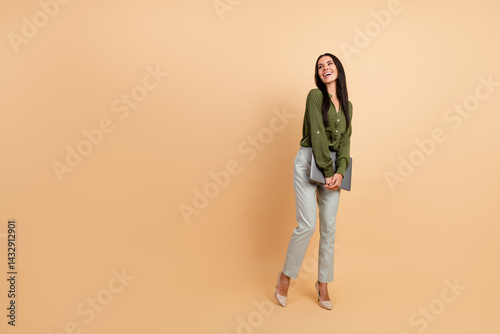 © deagreez, Fototapeta premium Elegant professional woman in green top holding a tablet, posing confidently against a beige background