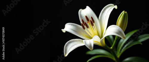 Fototapeta premium Elegant Pure White Lily Flower Isolated on Dramatic Black Background with Soft Natural Lighting