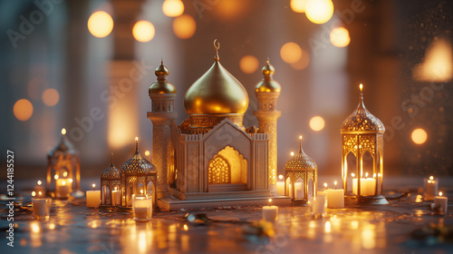 © Rony, Obraz premium Elegant Ramadan mini mosque with gold domes and lanterns