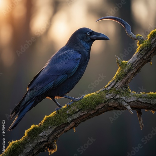© Watu ireng, Fototapeta premium Elegant Raven Perched on Mossy Branch in Natural Habitat.