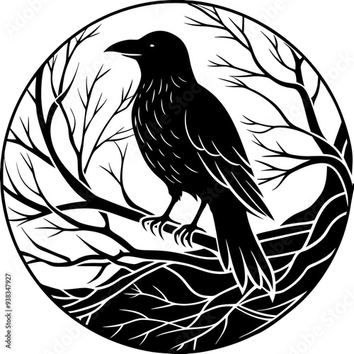 © design master, Naklejka premium Elegant Raven Silhouette Minimalist Black and White Vector Design with Eerie Gothic Symbolism Art vector illustration