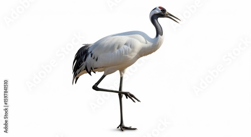 © Miya, Obraz premium Elegant Red-Crowned Crane Standing Gracefully on One Leg, Isolated on White