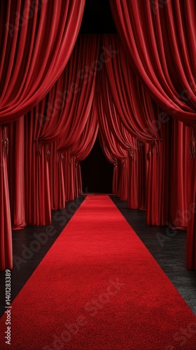 Fototapeta premium Elegant red curtains frame a luxurious red carpet leading to a darkened entrance in a grand venue