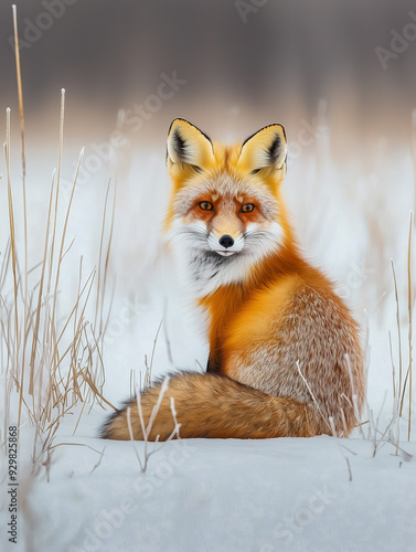 © WCPW PHOTOGRAPHY, Fototapeta premium Elegant Red Fox Sitting Gracefully in the Snowy Winter Field with a Calm Gaze Radiating Natural Beauty and Sharp Instincts Blending Vivid Colors with Pristine Snow in a Serene Frozen Landscape