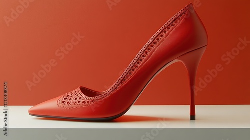 © Sampao, Obraz premium Elegant red high heels with intricate stitching, displayed on a clean white surface with a vibrant orange background.