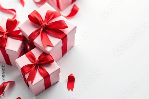 © Patama, Obraz premium Elegant red ribbon tied gift boxes on white background, wrapping, ornate