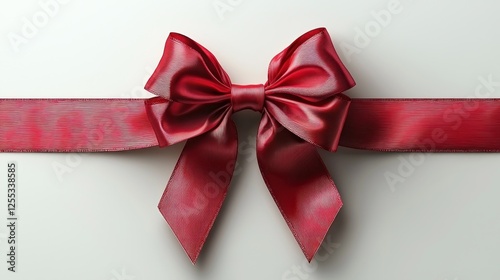 Fototapeta premium Elegant red satin bow tied on a ribbon, showcasing a smooth texture against a light background, ideal for gift wrapping