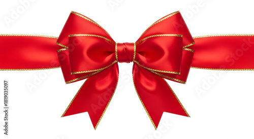 Fototapeta premium Elegant red satin ribbon bow with gold trim on white background