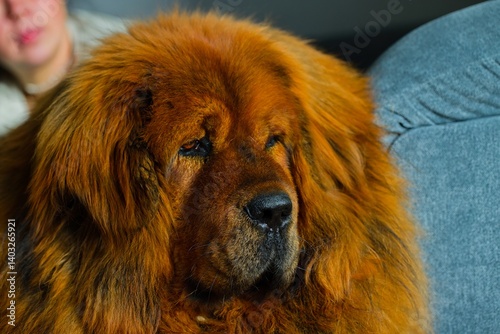 © Grzegorz, Fototapeta premium Elegant red Tibetan Mastiff sprawled on a gray couch, bathed in gentle window light.
