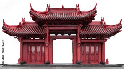© Tanu, Naklejka premium Elegant red traditional Chinese architecture with intricate detailing in a serene setting enhances cultural beauty and heritage