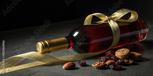 Fototapeta premium Elegant red wine bottle wrapped in a golden ribbon rests on a dark surface, surrounded by dried fruits and nuts