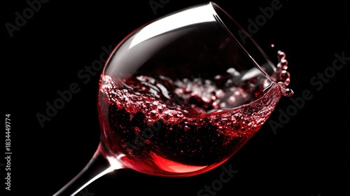 Obraz premium Elegant red wine swirling in a crystal glass against a stark black backdrop,...
