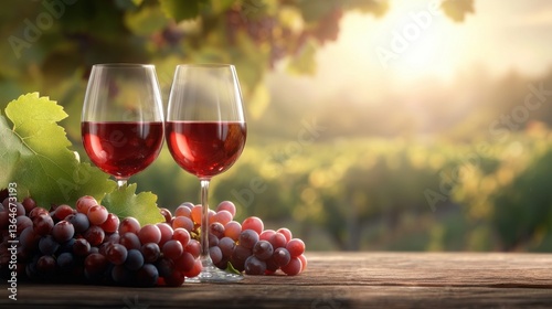 © tuiphotoengineer, Fototapeta premium Elegant red wine tasting experience set in a vibrant and lush vineyard landscape Two glasses of deep red wine on a rustic wooden table with fresh grapes and autumn foliage in the background