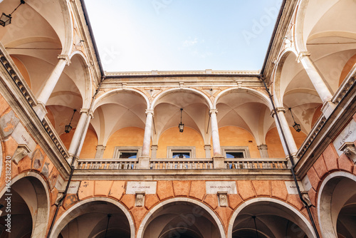 © Andrei Antipov, Fototapeta premium Elegant Renaissance courtyard with marble columns and vaulted arches inside Palazzo Doria-Tursi on Via Garibaldi.