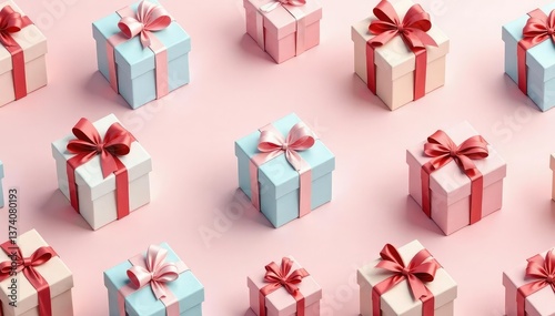 © Prasert, Fototapeta premium Elegant repeating gift box pattern, pastel hues, bow, seamless
