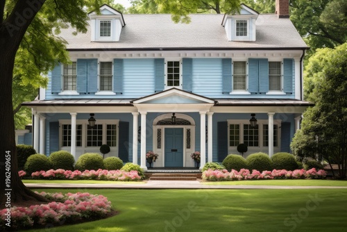 © nsit0108, Fototapeta premium Elegant residential home featuring a porch, dormer windows, and vibrant front yard landscaping