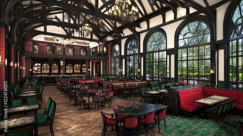 © Big9869, Naklejka premium Elegant Restaurant Interior Design with Dark Wood and Green Accents