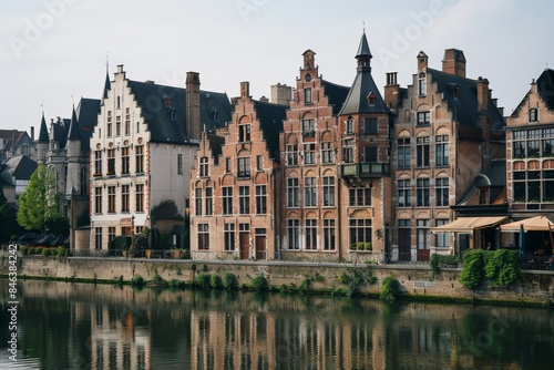 Naklejka premium Elegant riverside buildings with traditional European architecture reflecting...