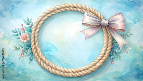 © david, Naklejka premium Elegant Rope Frame with Bow and Floral Accents on Watercolor Background.
