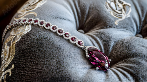 Fototapeta premium Elegant ruby and diamond necklace rests on plush velvet. A long strand of sparkling gems, with a prominent teardrop-shaped ruby pendant, graces a luxuriously textured, light gray velvet cushion