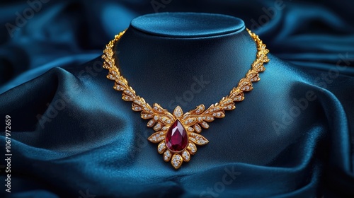 © Jiranath, Fototapeta premium Elegant Ruby Necklace with Intricate Gold Detailing