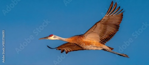 Fototapeta premium Elegant Sandhill Crane Flying Against Vivid Blue Sky