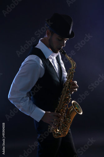 Obraz premium Elegant saxophonist plays jazz on dark background