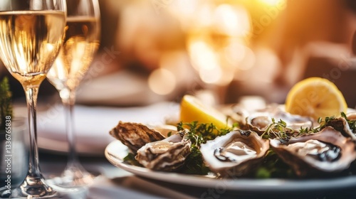 © Daphne, Naklejka premium Elegant seafood dining with fresh oysters and champagne at sunset